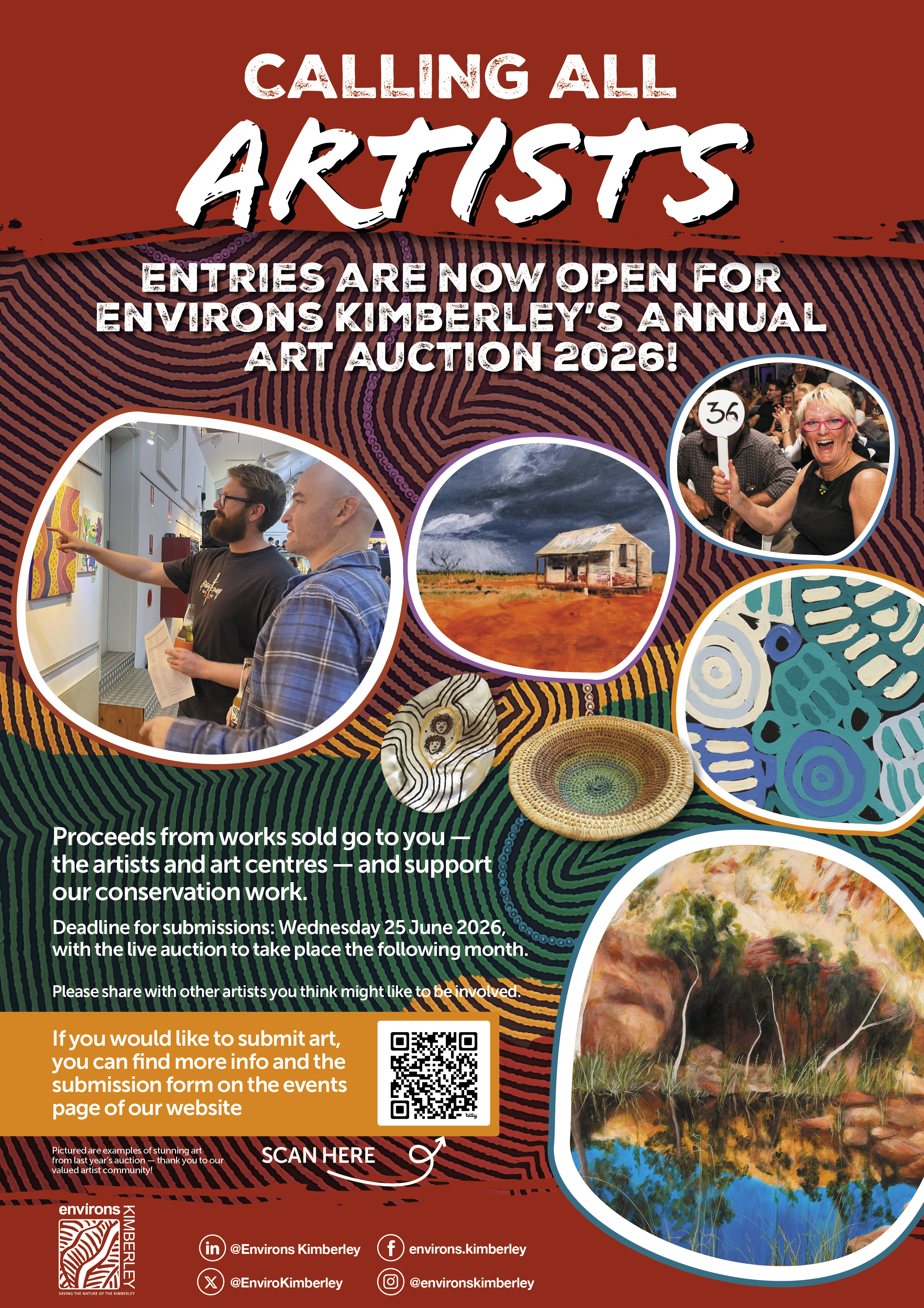 Proceeds go to the artists and art centres for works sold, and support the conservation work of Environs Kimberley.